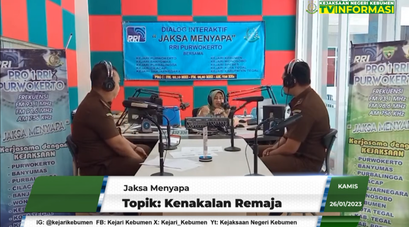 Program Jaksa Menyapa Kejaksaan Negeri Kebumen dengan RRI Purwokerto tanggal 26 Januari 2023 bertempat di RRI Purwokerto dengan tema “Kenakalan Remaja”. Narasumber kegiatan tersebut adalah Kasi Intelijen Ahmad Sudarmaji, S.H. dan Kasi PB3R Arif Andiono, S.H., M.H.